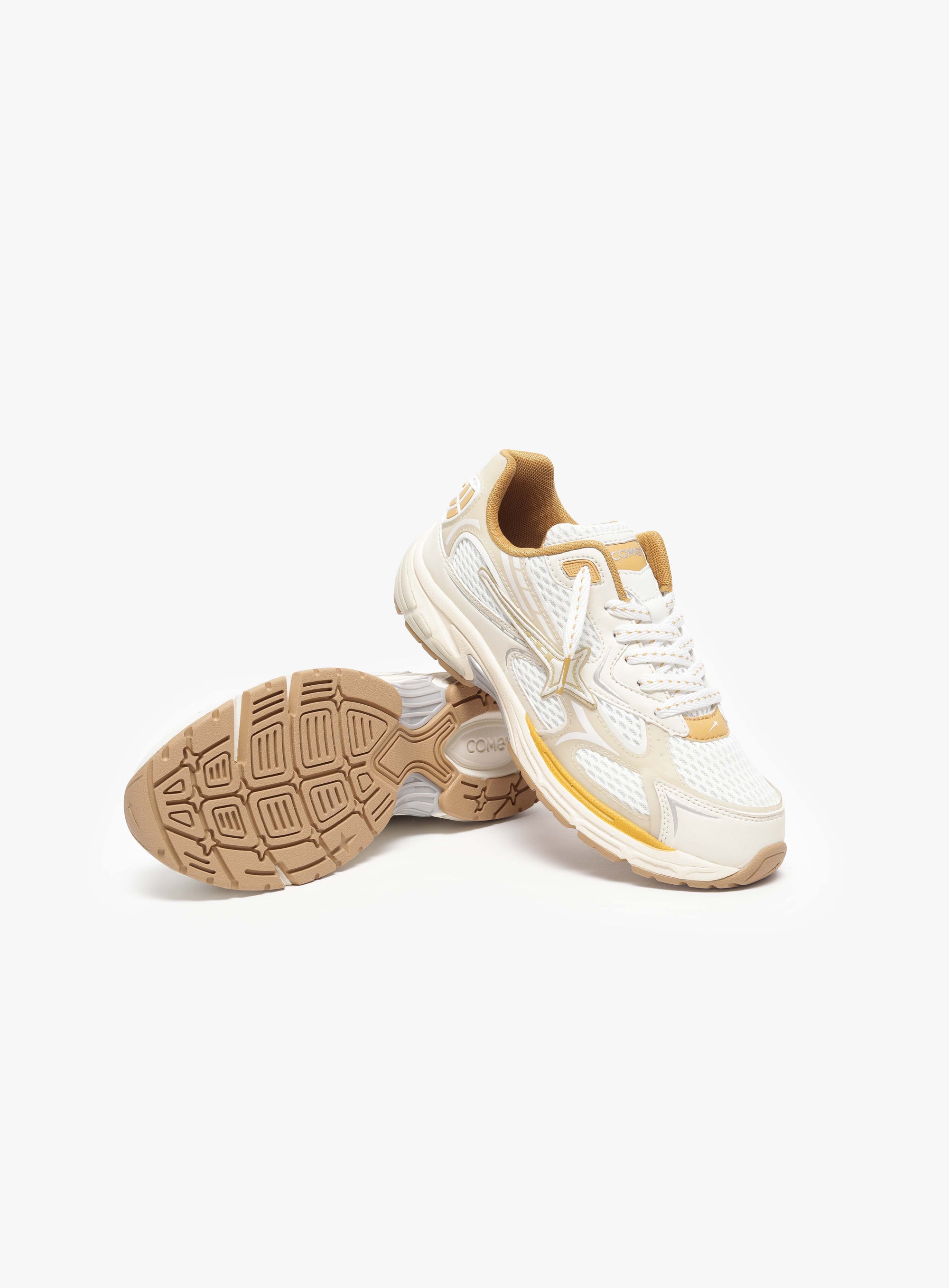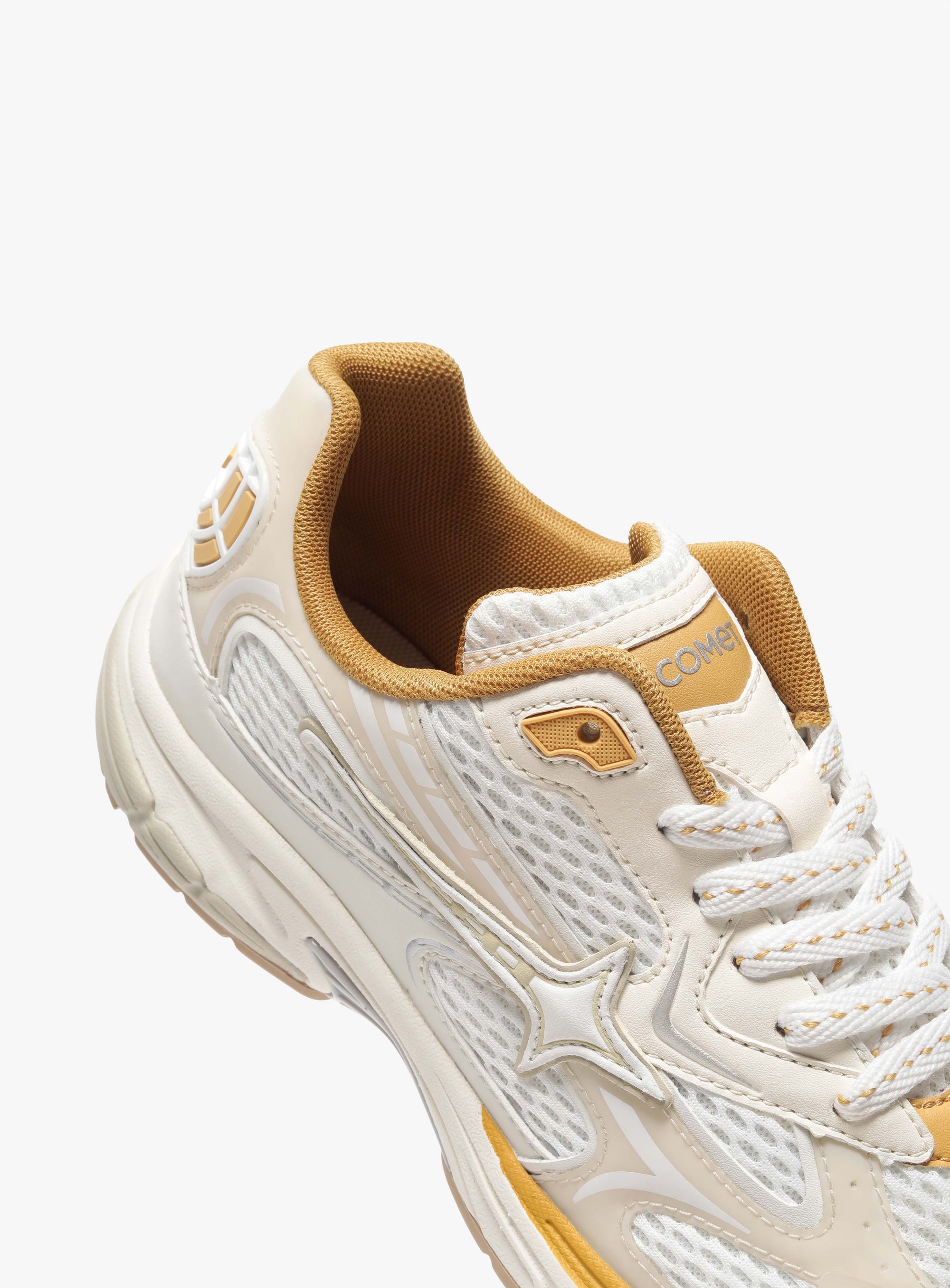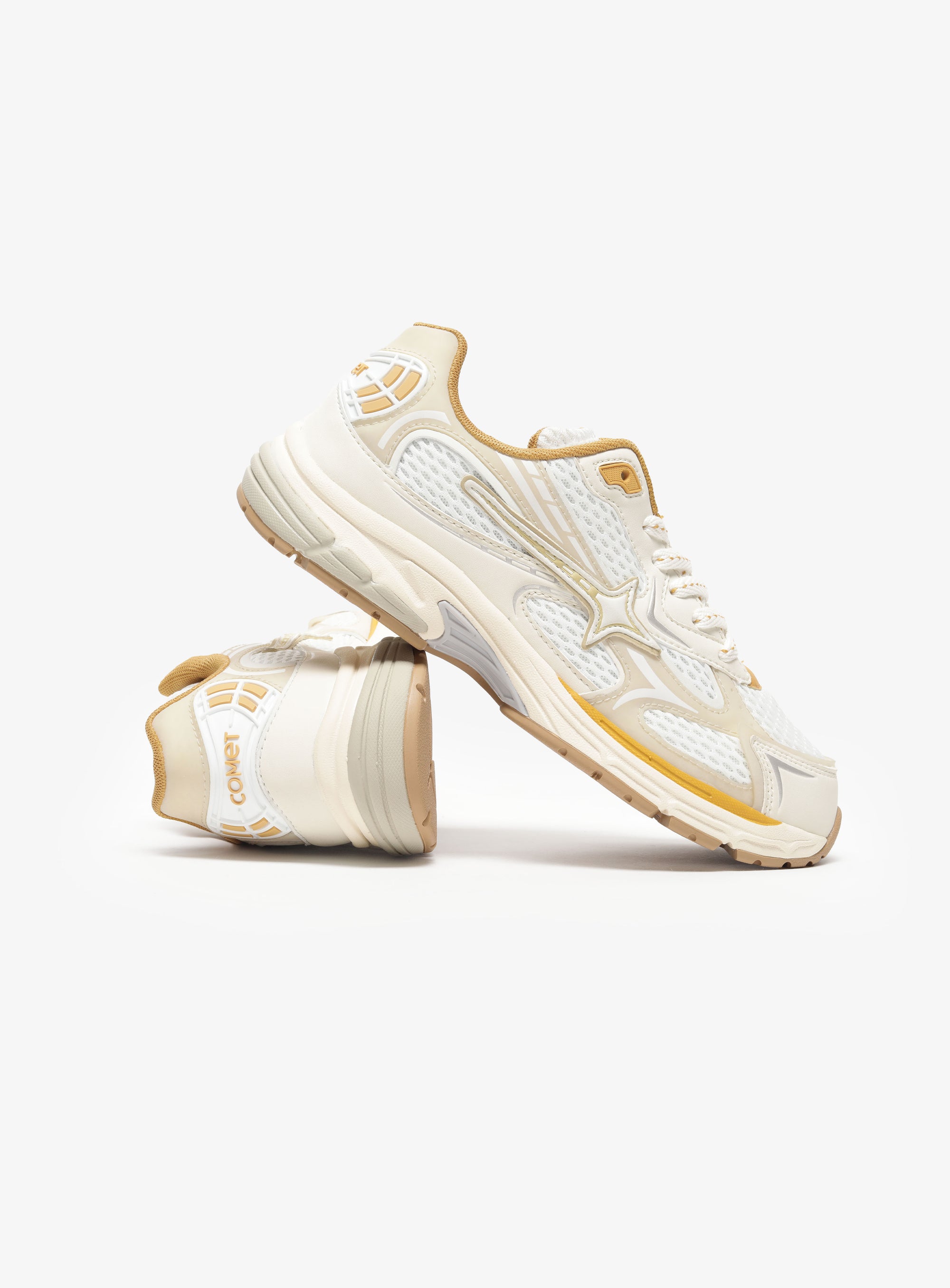 Photon is a sport-inspired lifestyle sneaker named after the smallest unit of light. A clean white base reflects that clarity, while sharp gold accents move through the upper like flashes of illumination, revealing depth in the layered construction.