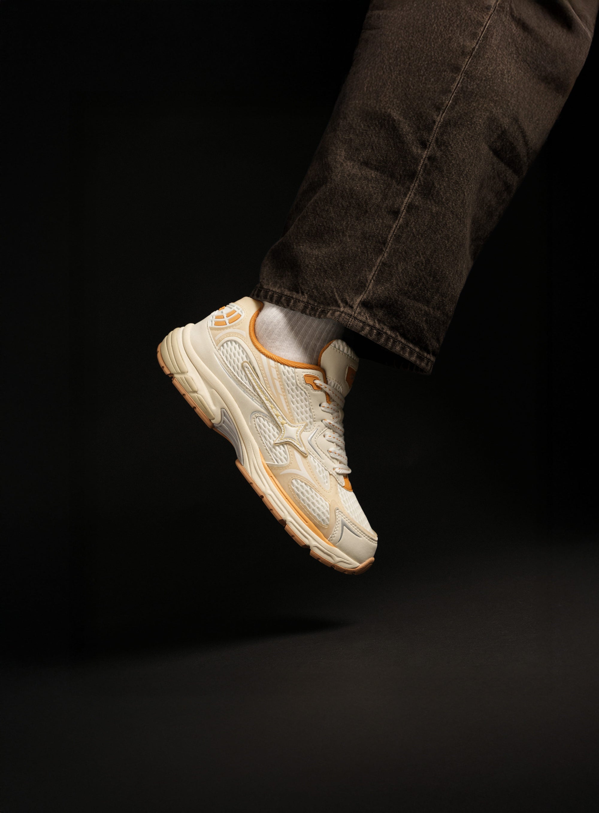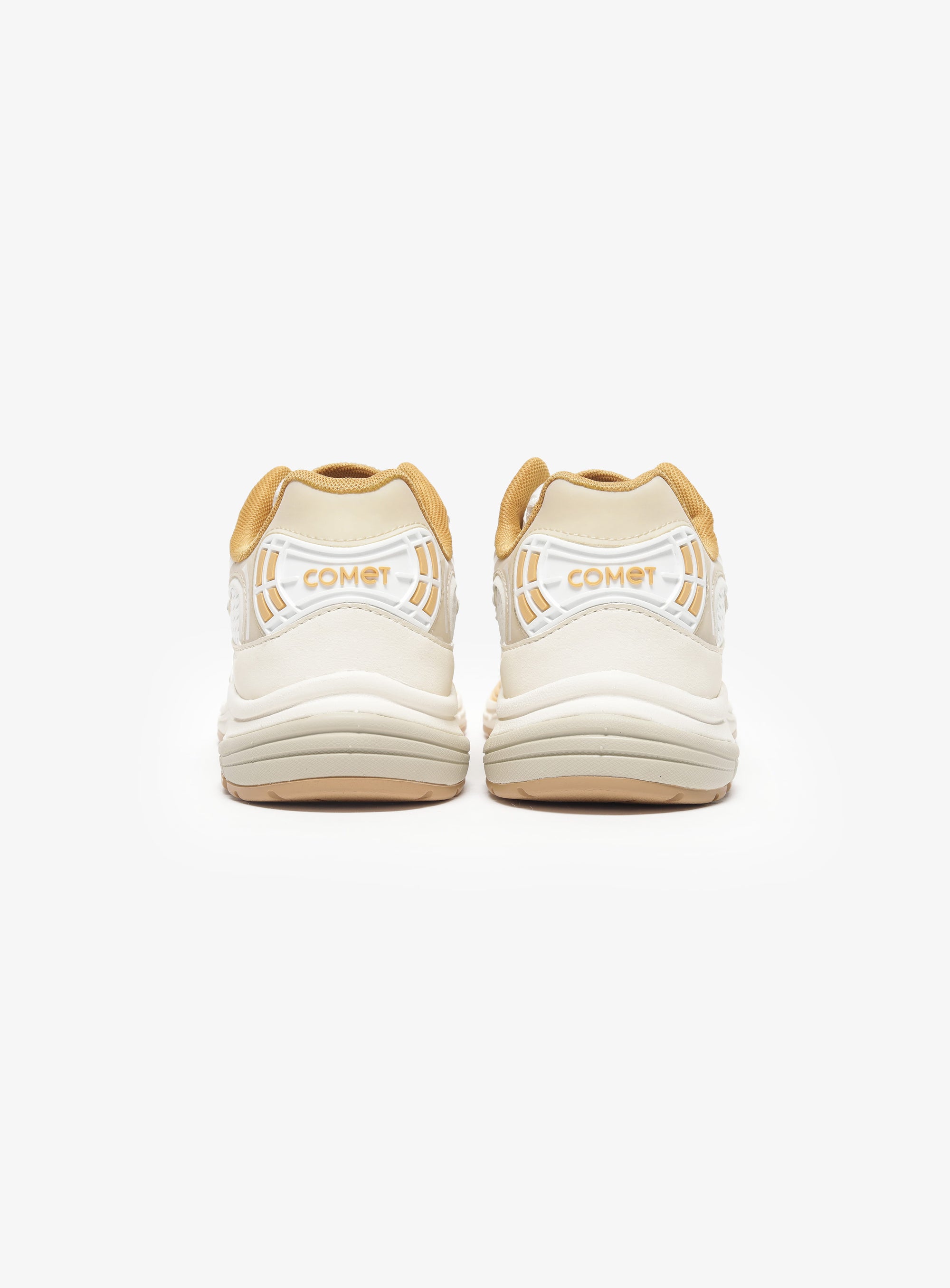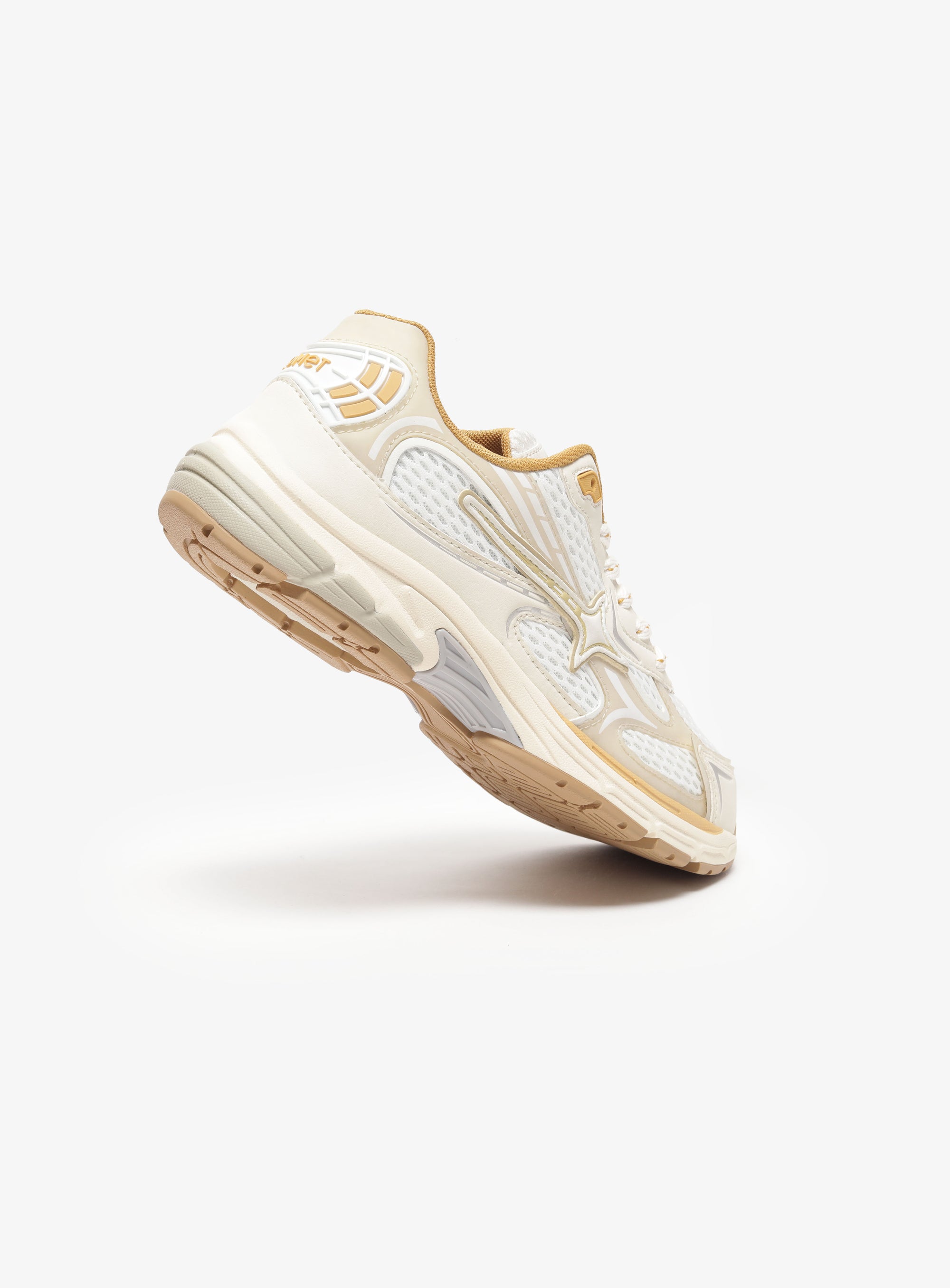 Photon is a sport-inspired lifestyle sneaker named after the smallest unit of light. A clean white base reflects that clarity, while sharp gold accents move through the upper like flashes of illumination, revealing depth in the layered construction.