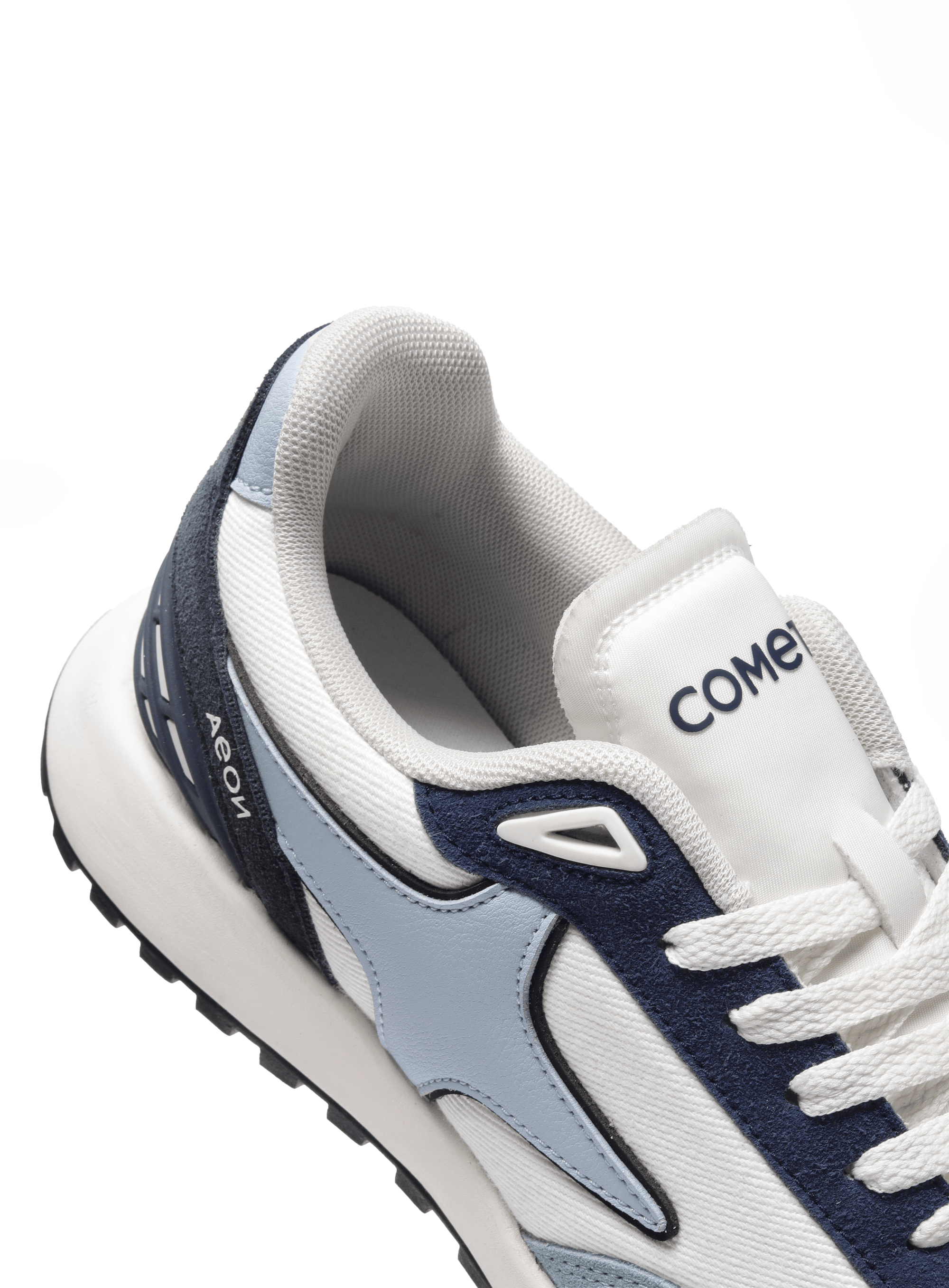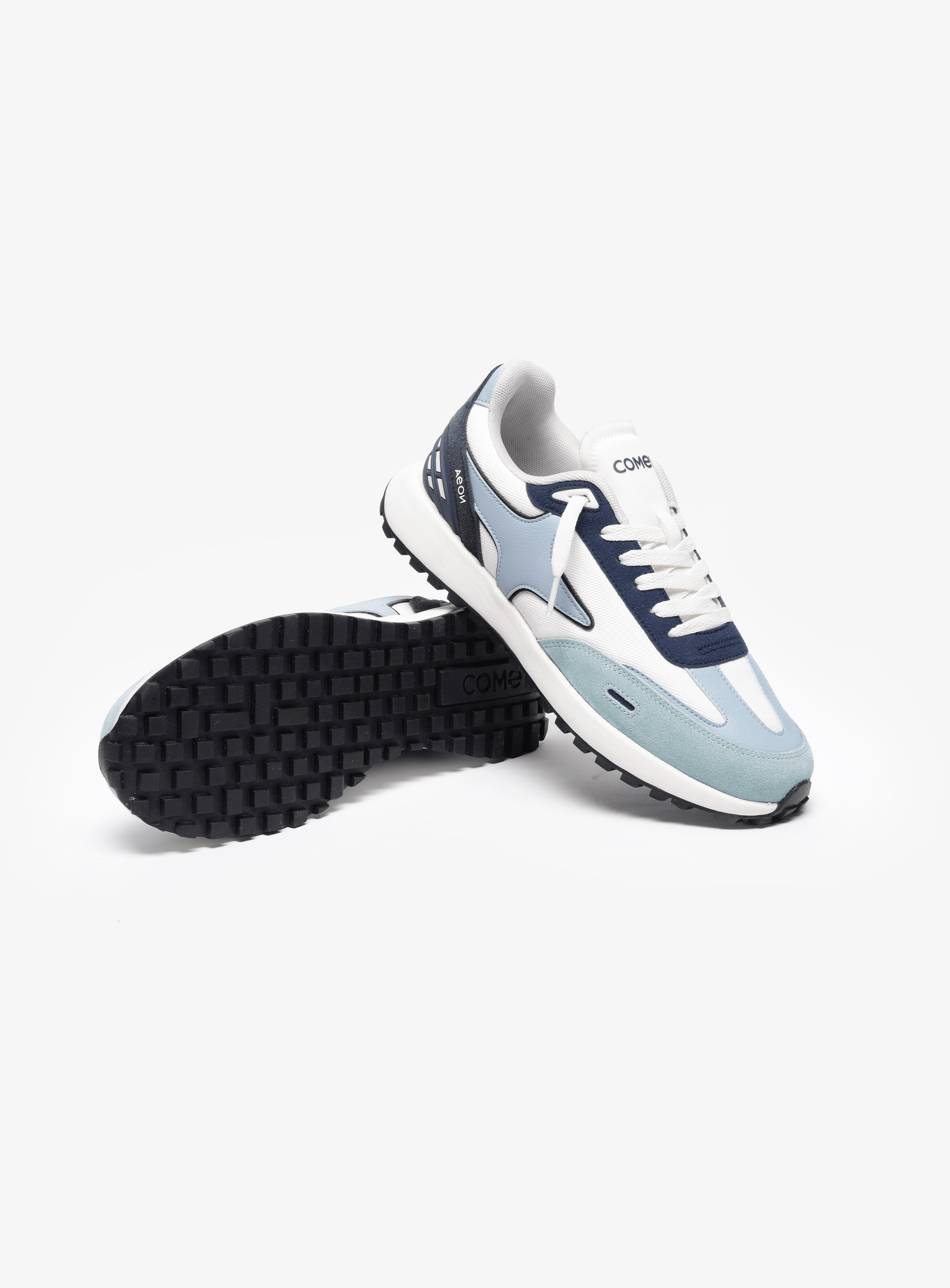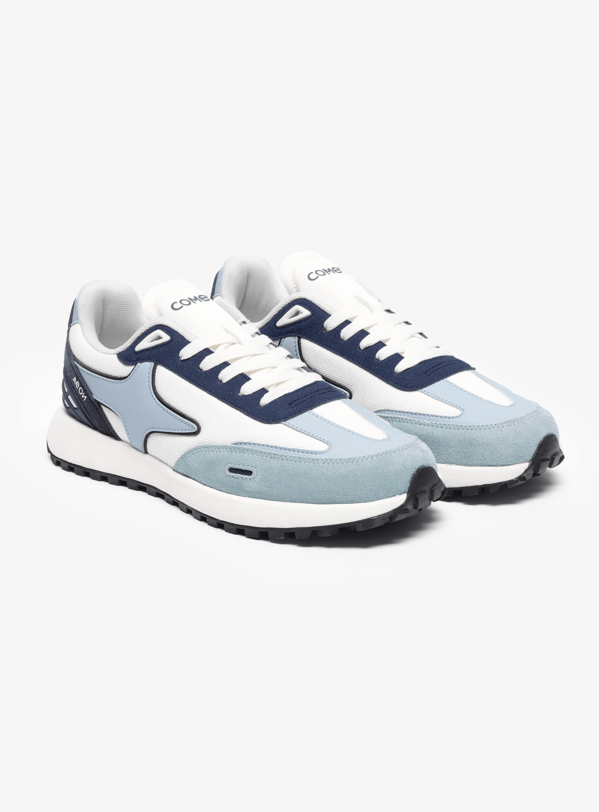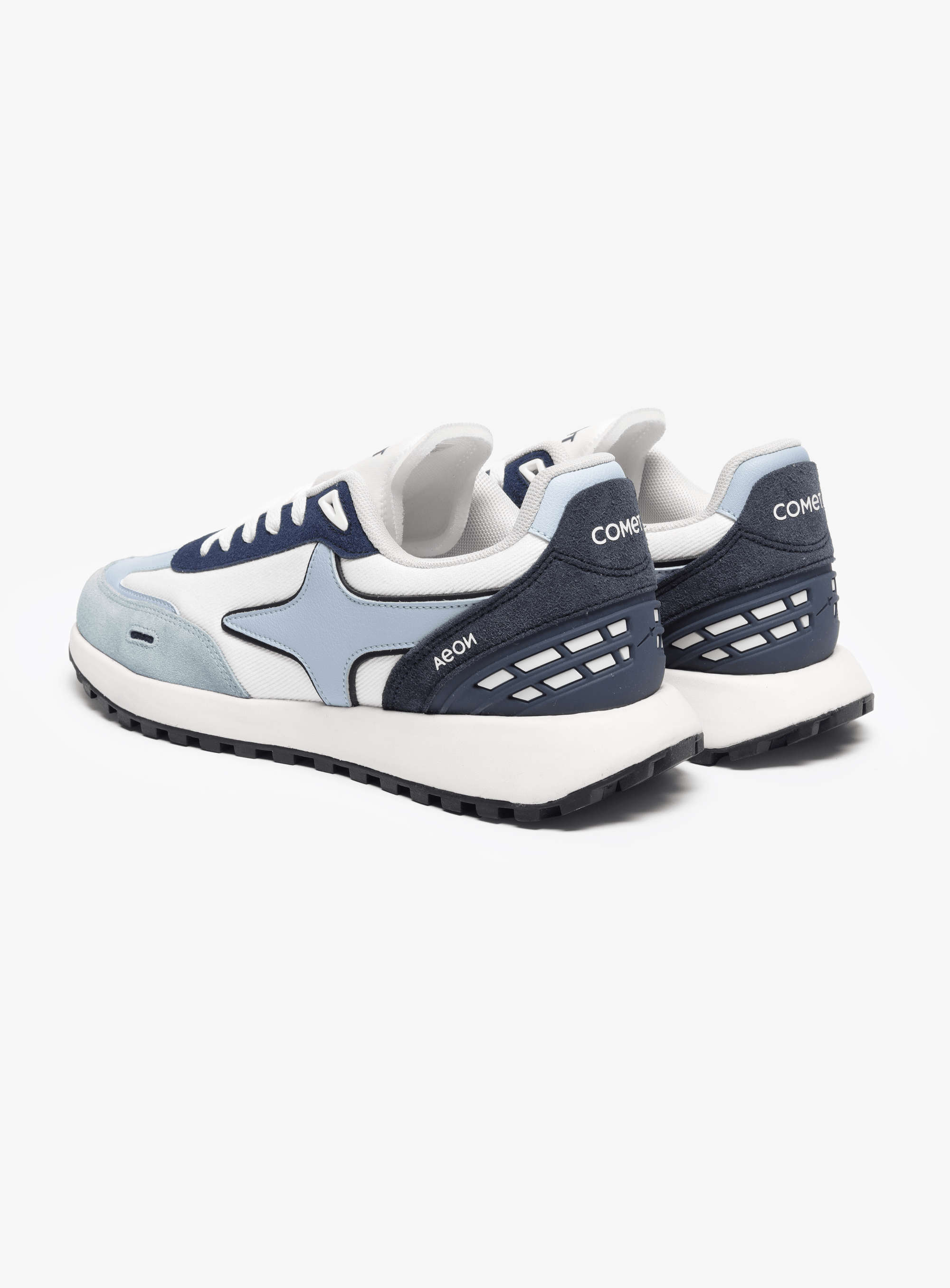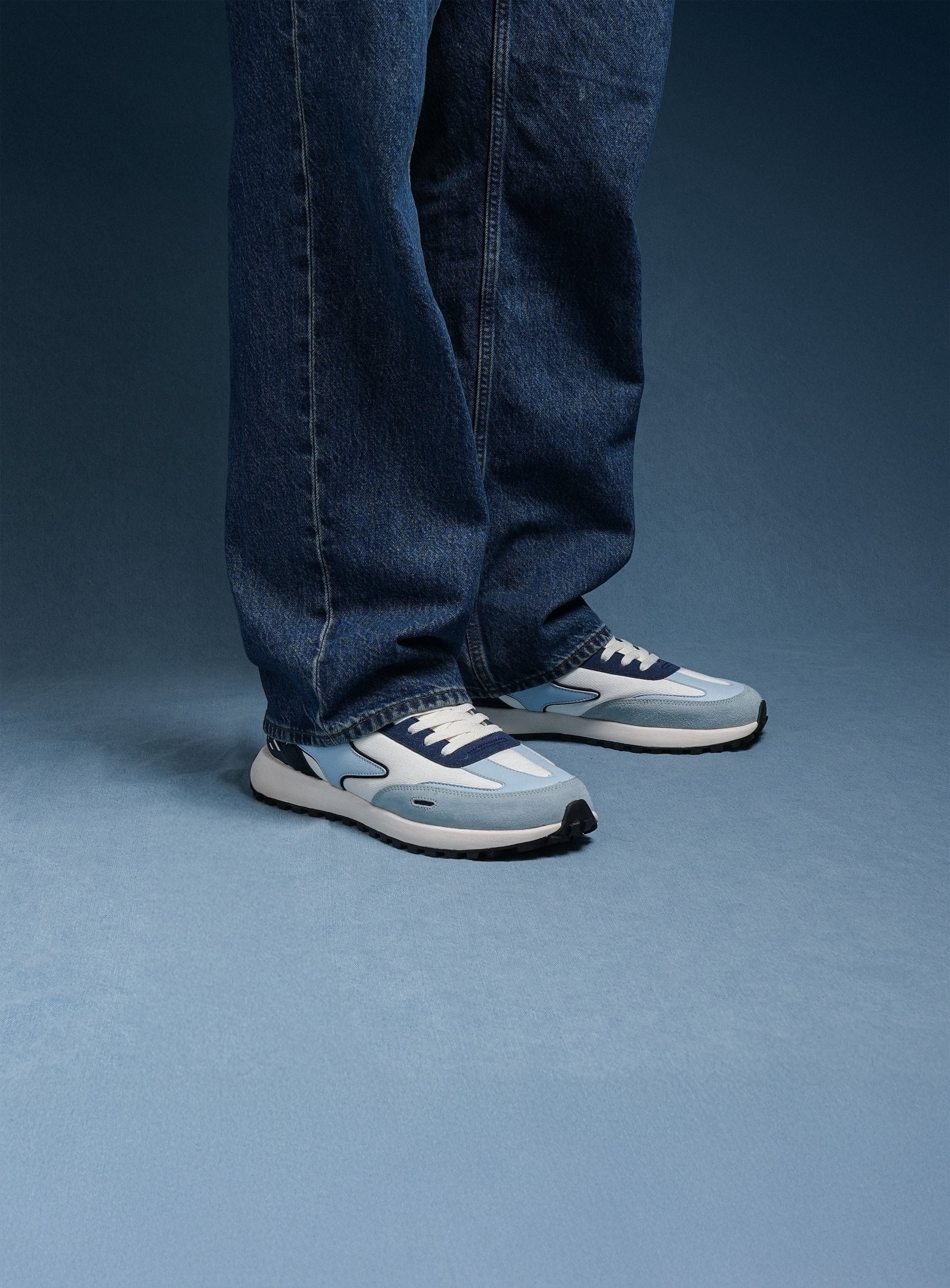 Nimbus is built from the language of clouds: weightless, calm, and quietly confident. A soft light-blue base mirrors open skies, while a crisp white side panel cuts through like sunlight on a clear day. The blue suede mudguard grounds the shoe with subtle texture, wrapping gently around the toe like a rolling horizon. Under the laces sits a deep storm-blue panel, echoed again on the supportive heel cage to add depth and balance to the airy palette. Finished with clean white laces and a matching light-blue logo, Nimbus feels like walking through still air: light, effortless, and endlessly wearable.