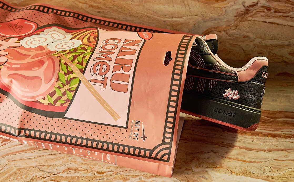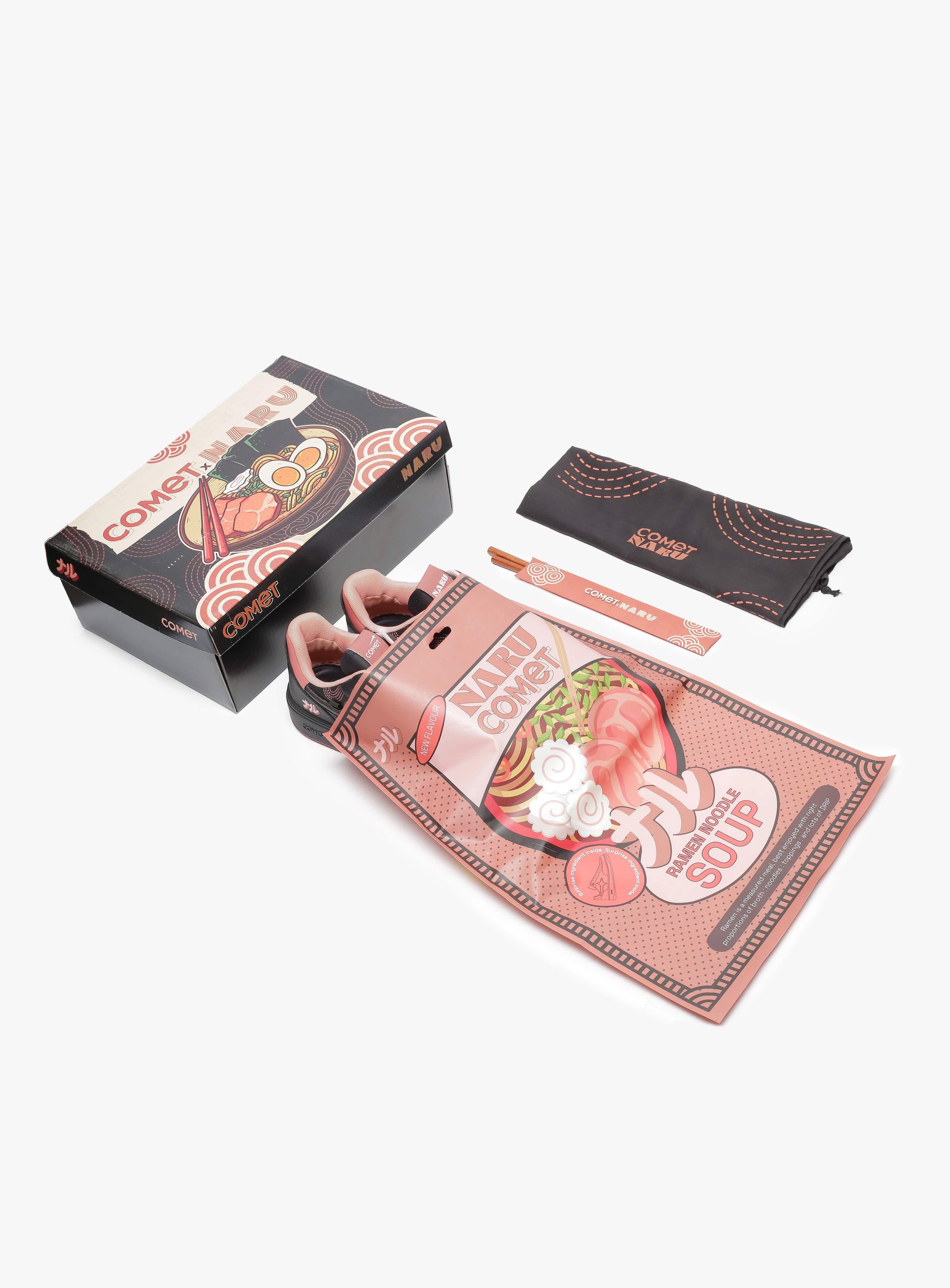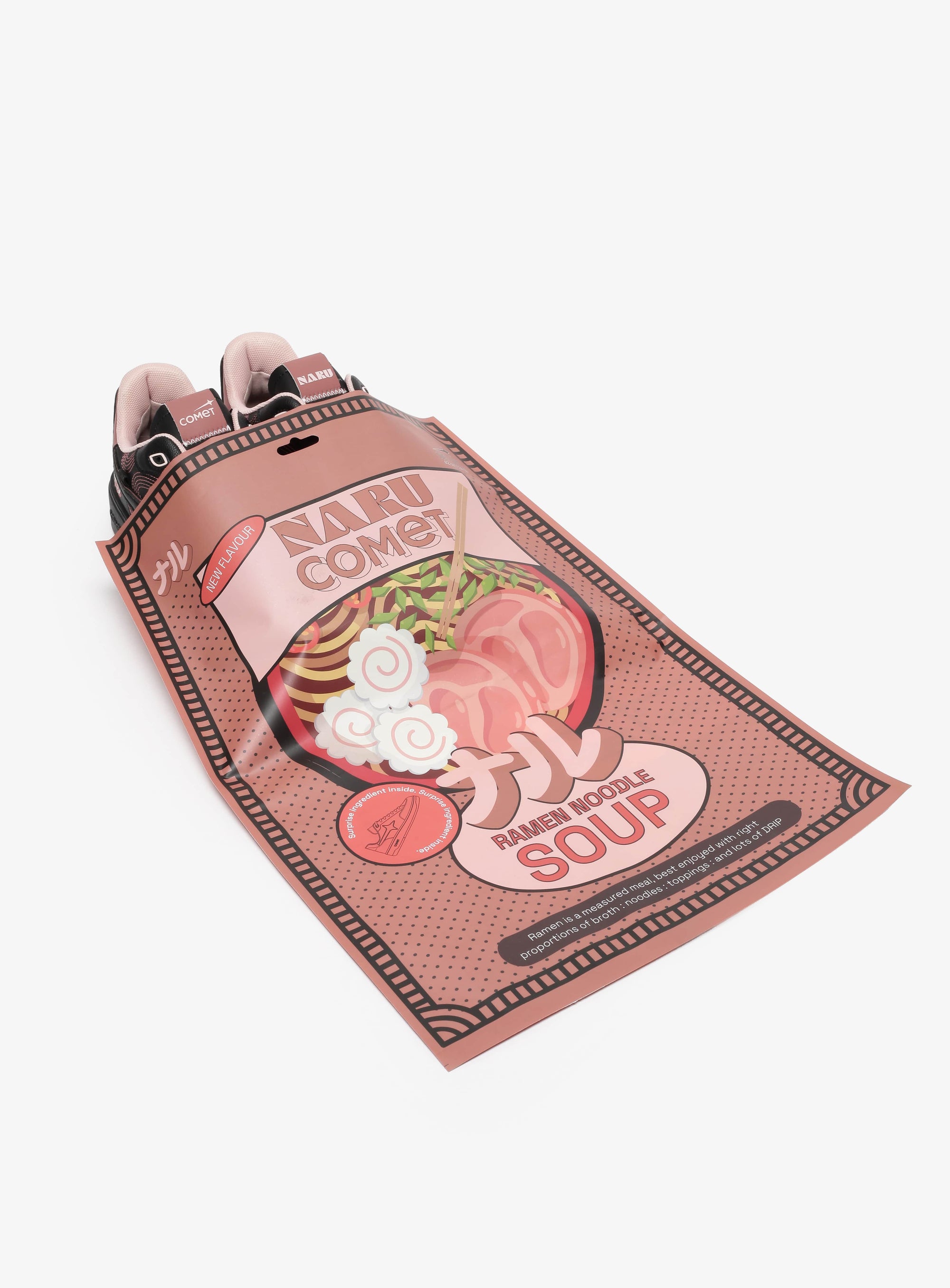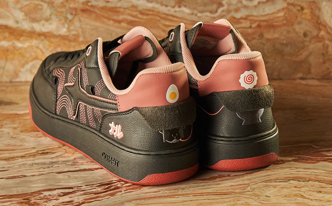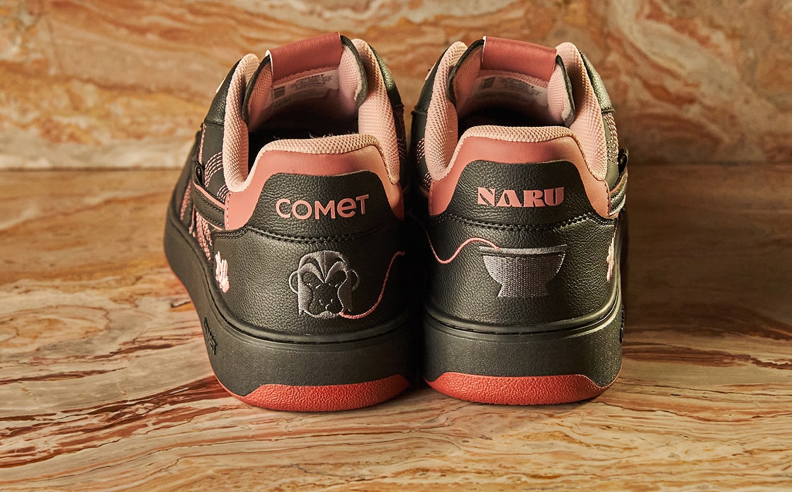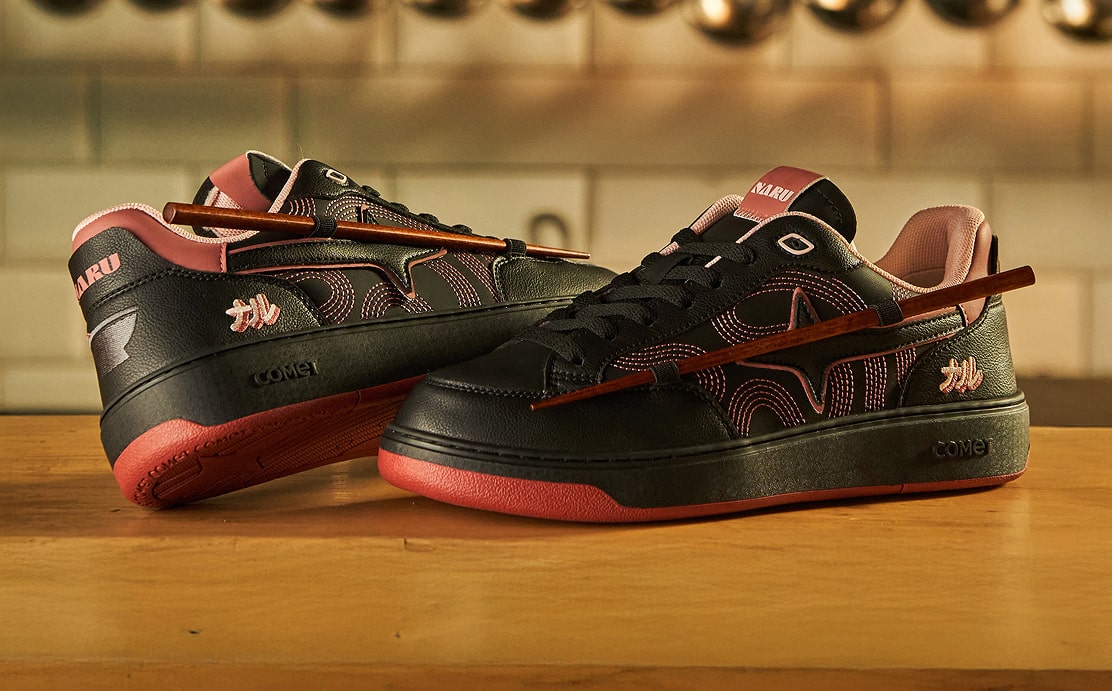 It draws from the world Naru has carefully cultivated - layered, precise, and full of intent. Signature embroidery, chopstick detailing, the ramen bowl artwork, and the iconic mascot all take their place. The black of the sneaker comes from Naru’s chef’s uniform. Hidden beneath the heel tabs, Uzumaki and Ajitama reveal themselves - quiet nods for those who know where to look.