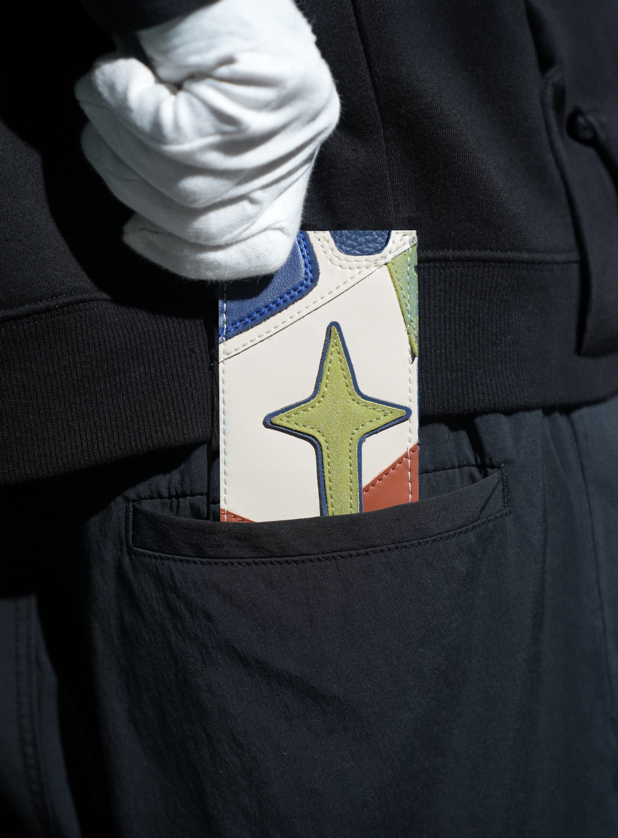Project 004 morphs rejected kicks into slick cardholders, each a canvas of sustainable innovation that is Never Shy, Never Sorry. Four unique designs stand proudly side by side, their star-shaped centrepieces catching the light.