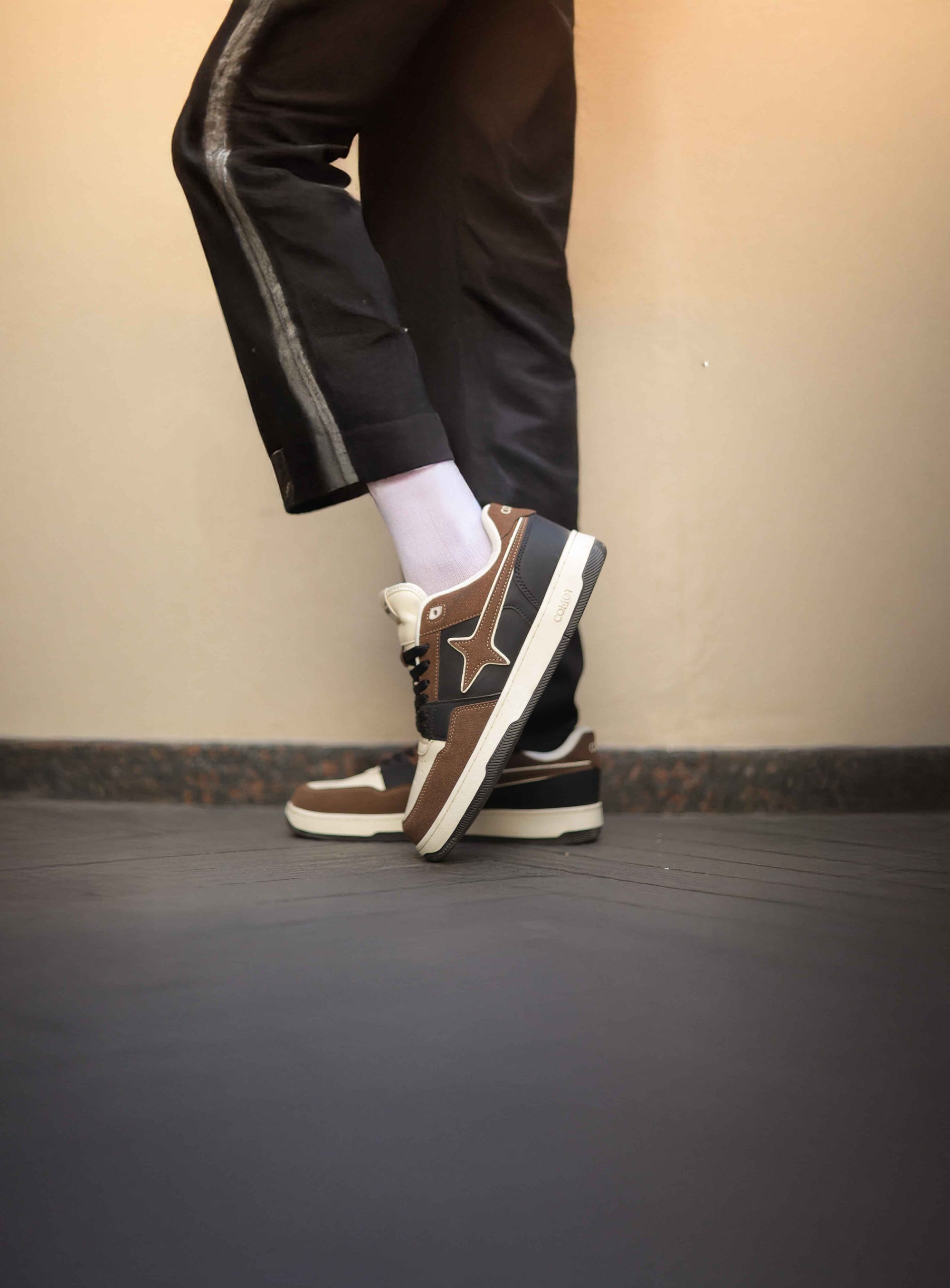 The Chestnut embodies classic autumn warmth with its rich brown accents and protective black shell. The creamy white toe cap mirrors the pale interior of a fresh chestnut.